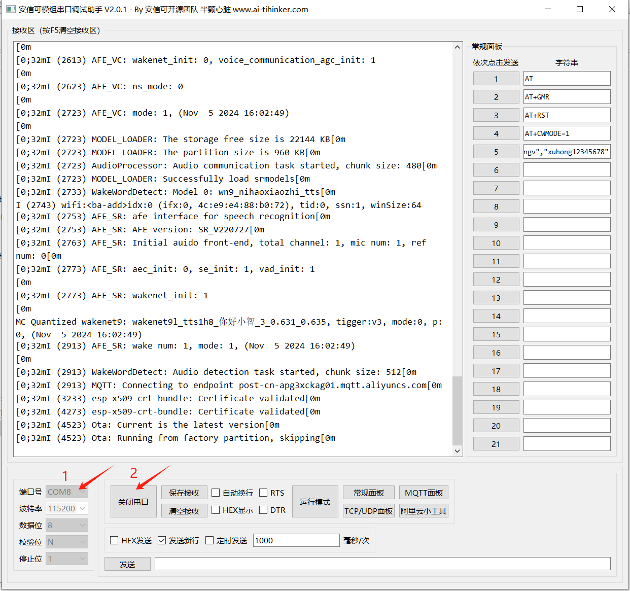 4)如果你不能确定开发板固件程序已经烧录成功,需要用到串口通信工具检查,到QQ群文件中下载串口工具(安信可串口工具,免安装),选择ESP32S3开发板右边对应COM端口连接,打开串口工具查看输出信息。 如果自己看不懂请完整拍照到Q群提问。