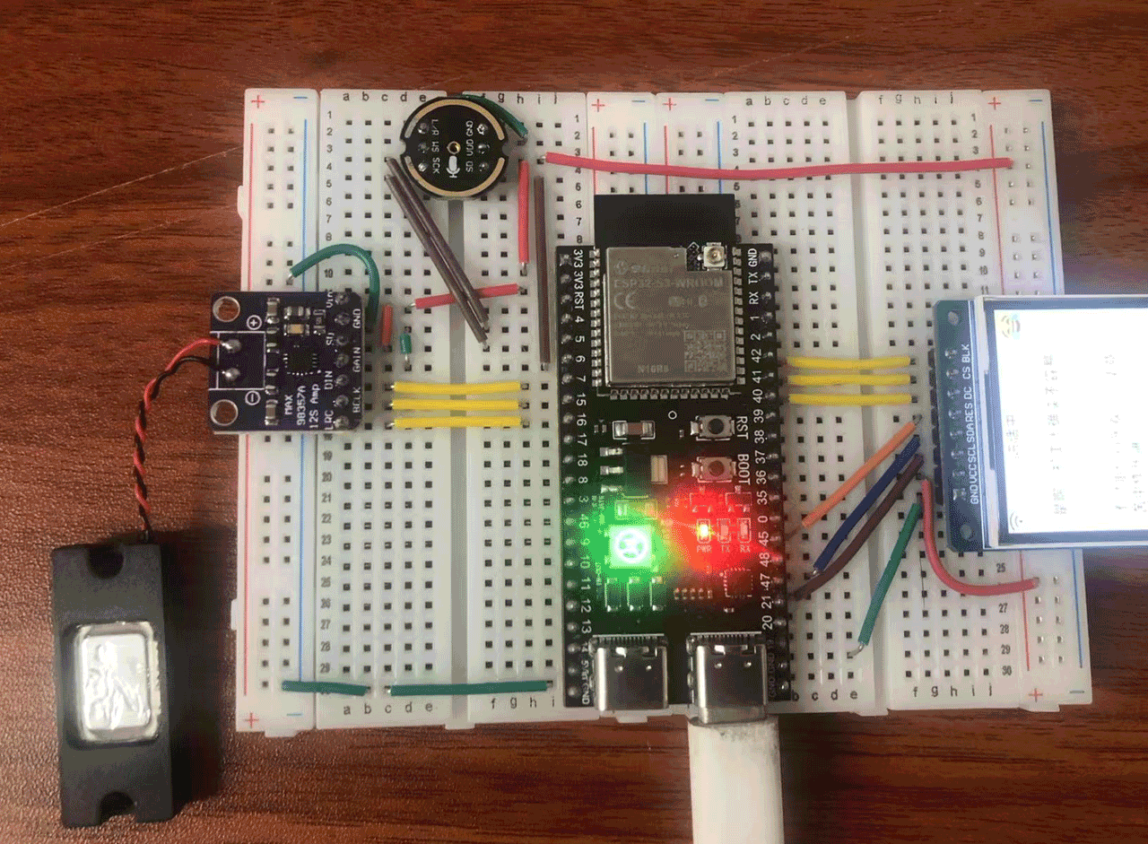 本接线方案适用于小智AI聊天机器人面包板wifi版LCD固件版本 >=V1.2.0,为了方便快速上手和演示,均使用了飞线(跳线)进行连接,具体引脚请参考2.1接线对接表格。